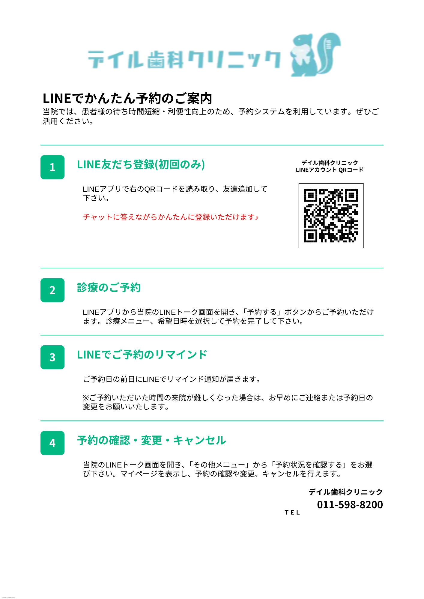 現在は、アプリ「MyDental」を利用してい頂いていますが令和8年3月より「LINE」を利用したものに替わります!変更に伴い、デイル歯科クリニック公式LINEを開設しましたのでアクセスQRコードを掲載致します